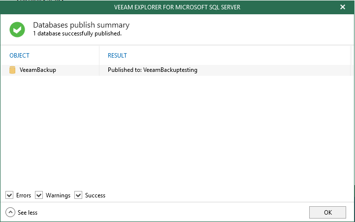 You can also see the Database listed as “Published” in the Veeam Explorer.
