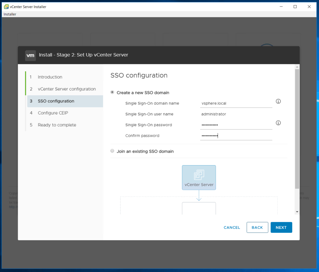 - In my case this is a new SSO domain, you can however join an existing SSO domain if you already have one in your environment.