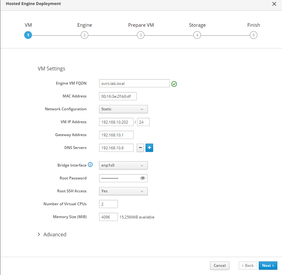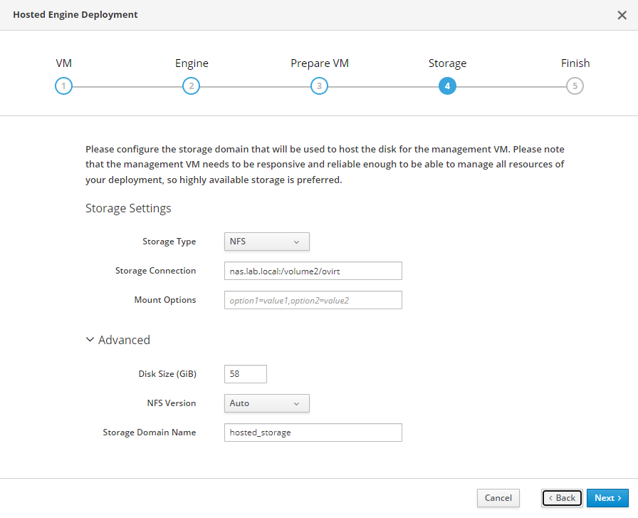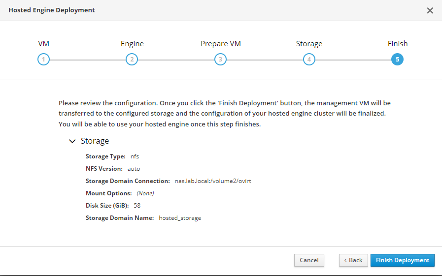 As this is just a lab environment we will be deploying our hosted engine on our single node cluster