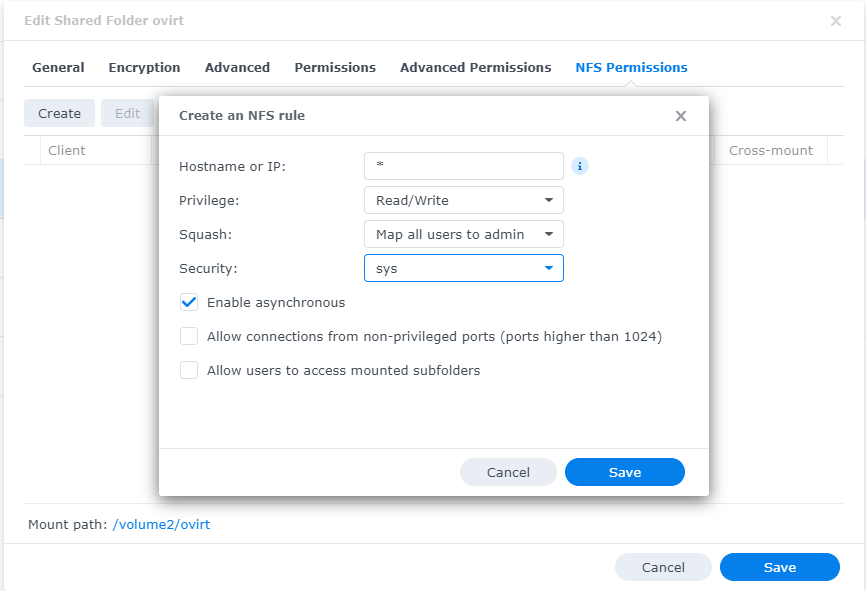 I am using my Synology NAS for my NFS share with the following configuration, again this is a lab environment, If you are deploying this in production please confirm with your network/security team regarding these options.