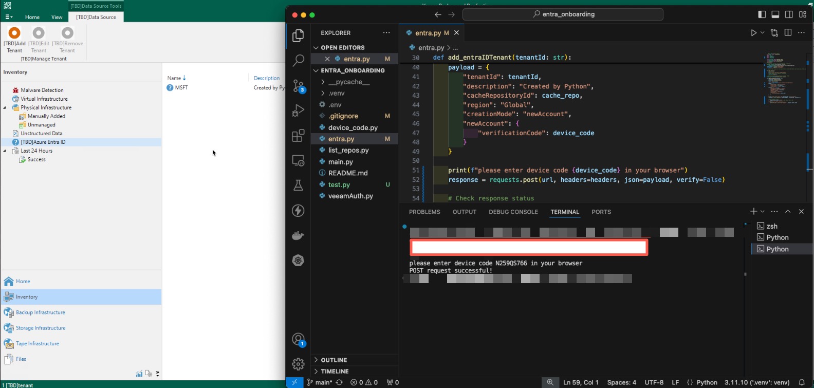 Next, we will make the required API call to the VBR server. This call will remain in a waiting state for a set period until it receives authorization confirmation from Microsoft. This is why the first step is necessary: after initiating the API call, it will wait until the customer has successfully authenticated. Once authentication is confirmed, the API call will complete successfully, adding the EntraID tenant.