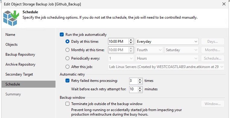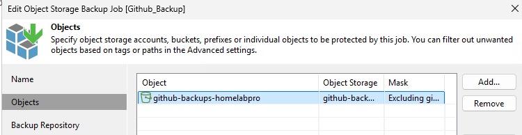 To get started, we need to create a backup job that targets an S3 storage location—the home for our GitHub repository bundles. These bundles are generated using a pre-script that automates the process.