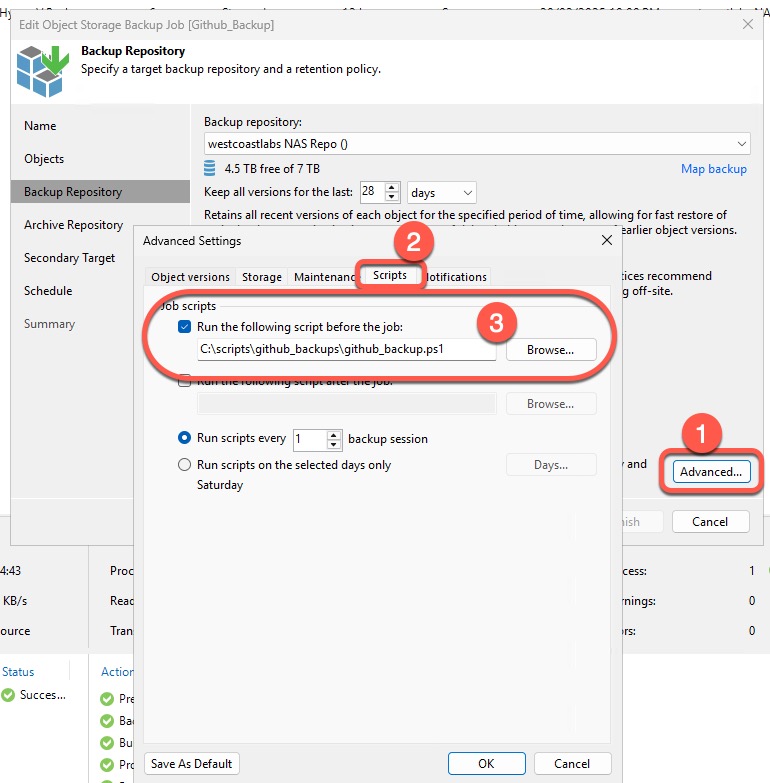 - This is where we configure the PowerShell script to run before the job execution. This script updates the S3 location with the latest repository backup from GitHub.